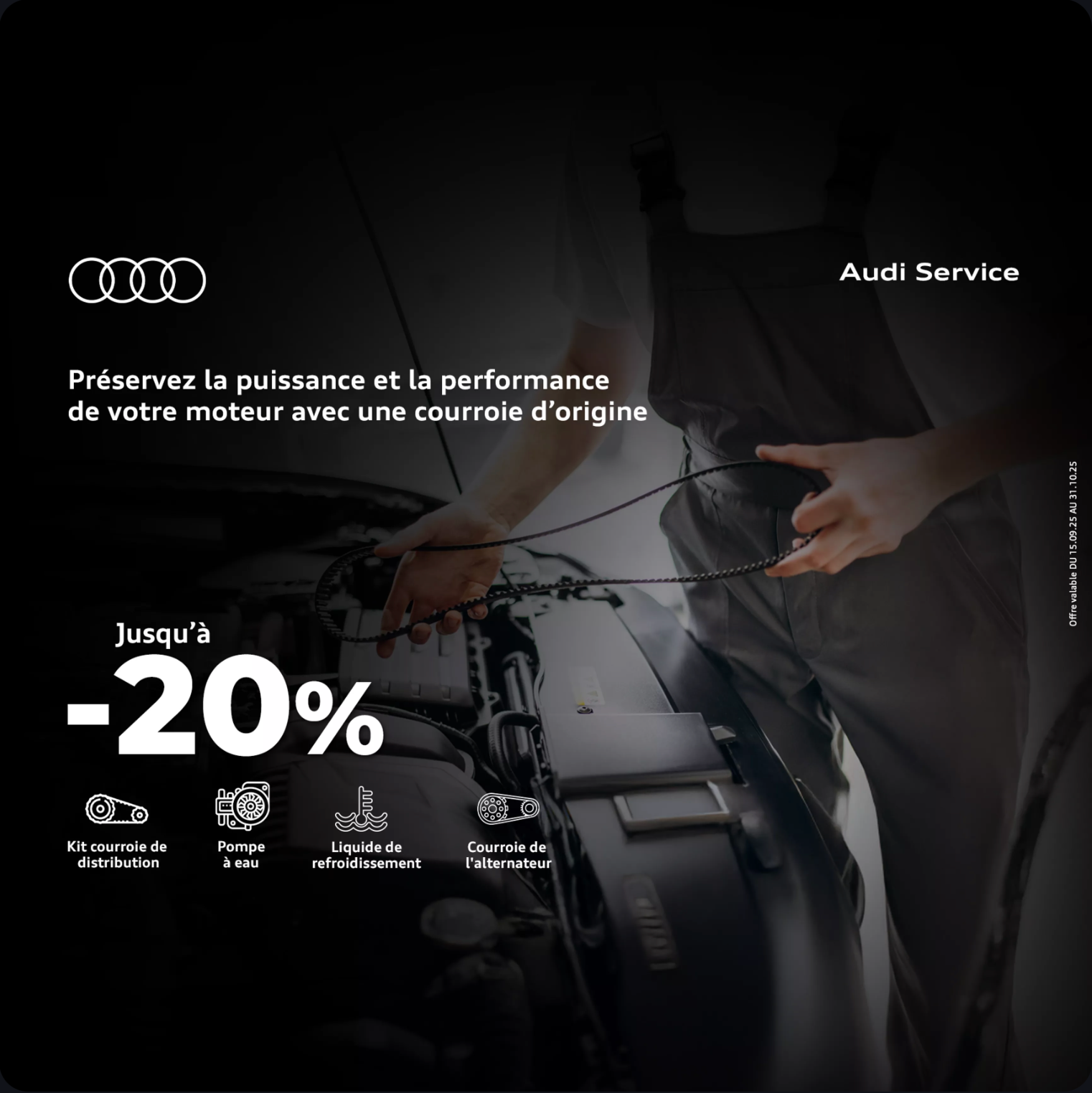 Jusqu’au 31.10.2025, offrez à votre Audi jusqu’à 20% de remise sur le Kit courroie, Pompe à eau, Liquide de refroidissement et Courroie de l’alternateur.